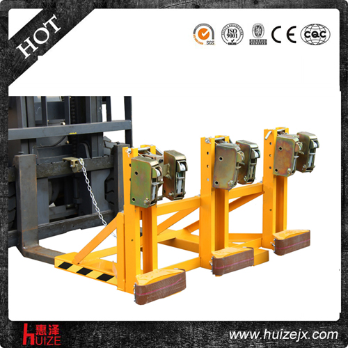 重型三油桶夾具單鷹嘴純機(jī)械機(jī)構(gòu)設(shè)計可與叉車方便地配合,僅依靠叉車的動作,不需要其它的動力,可自動一次搬運3個塑料油桶, 配置可拆換式柔性耐磨保護(hù)墊,有效保護(hù)油桶并緩沖叉車行駛過程中的震動, 能在集裝箱等這樣狹小的環(huán)境內(nèi)裝卸桶裝物質(zhì),可極大地提高空間利用率, 與貨叉連接配有自鎖裝置確保油桶夾在坡度上和顛簸路面使用時不會滑落.